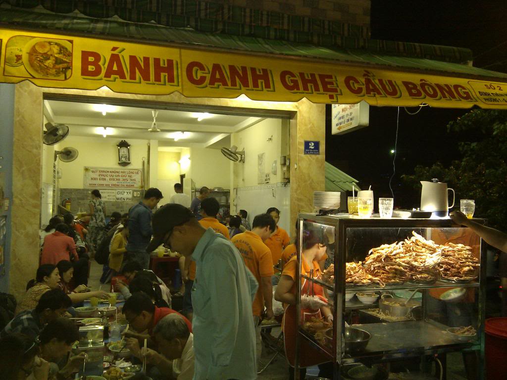 Có thể nói hàng bánh canh ghẹ tại Cầu Bông là nơi đầu tiên giới thiệu món ăn này đến thực khách Sài Gòn. Quán khá nhỏ nên vào giờ cao điểm, các thực khách phải chờ rất lâu mới “săn” được chỗ ngồi. Riêng những ngày mưa, có người còn trùm áo mưa đứng chờ, không quên liếc sang bên cạnh ngắm con ghẹ đỏ au, óng ả điểm xuyết những cọng bánh trắng tròn với thứ nước dùng được nấu từ gạch, thịt ghẹ, xương ống có vị thanh, ngọt, thơm khó cưỡng.