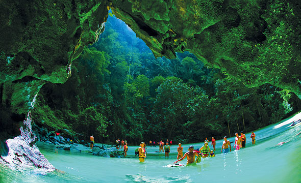 Khi tới đây, bạn đừng quên cầm theo một ngọn đuốc vì hang động là một khối tam giác chìm trong bóng tối. Bơi thuyền qua 70m trong hang, bạn sẽ thấy le lói ánh sáng mặt trời, đó là mục đích cuối cùng của bạn sau khi bơi qua 70m hang động, và quả thật bạn sẽ thấy công sức mình bỏ ra thật sự rất xứng đáng. Khi đã đến được điểm này của hang động, ánh sáng bên ngoài sẽ giúp bạn thấy được lờ mơ quang cảnh bên trong, còn cửa hang được bao phủ bởi rất nhiều rong rêu . Nghe thì không có gì đặc biệt nhưng chỉ khi bạn nhìn thấy màu xanh ngọc lấp lánh trong bóng tối thật huyền ảo, bạn mới cảm nhận được vẻ đẹp siêu thực, thoát tục của nơi này.